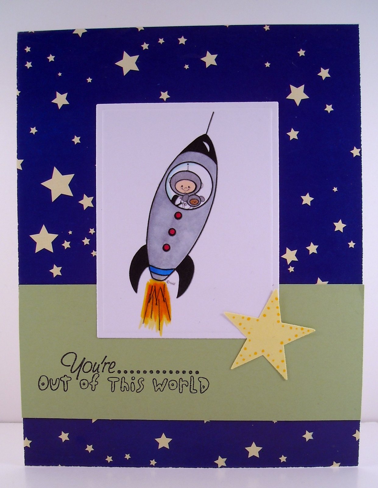 After coloring the image wtih my Copics I cut it down and rounded the corners and backed it on a lighter blue paper. I grabbed papers from one of my My Mind's Eye 6x6 paper pads and kept adding layers.